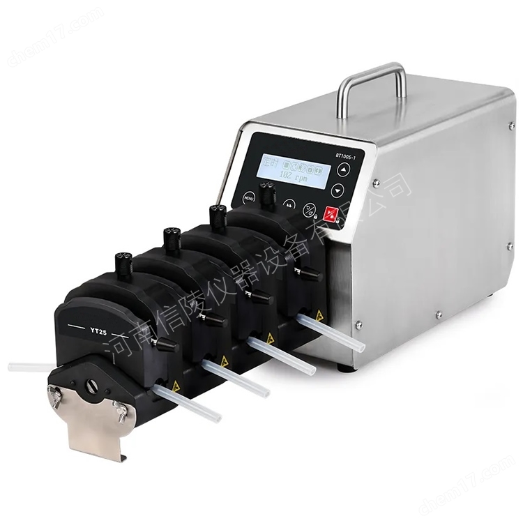 BT100S-1调速型多通道定时蠕动泵,流量范围是0.00011~750mL/min,转速范围是0.1~150rpm,可以实现8、12、16、24通道,即8、12、16、24支软管同时传输流体。具有启停、正反转、全速、调速、状态记忆等基本功能;可设定运行时间、间歇时间、循环次数等参数实现定时定量、液体分装的功能。具有转速缓停、回吸功能,可有效防止停机时液体滴落;采用进口内核处理器,高品质步进电机驱动,转速控制精度高达±0.5%;通过APP软件,可对泵进行远程控制,并对运行状态实时监测;RS485通讯,兼容Modbus协议,可通过多种信号模式与计算机、单片机、PLC、变频器、人机界面等上位机连接,实现系统化集中控制。在生物实验室中用于细胞培养、DNA提取、蛋白质纯化等实验;在化学实验室中用于液体分配、反应控制、样品前处理等环节,也常用于实验室中的制剂输送、试剂配制和化学反应等实验操作。
